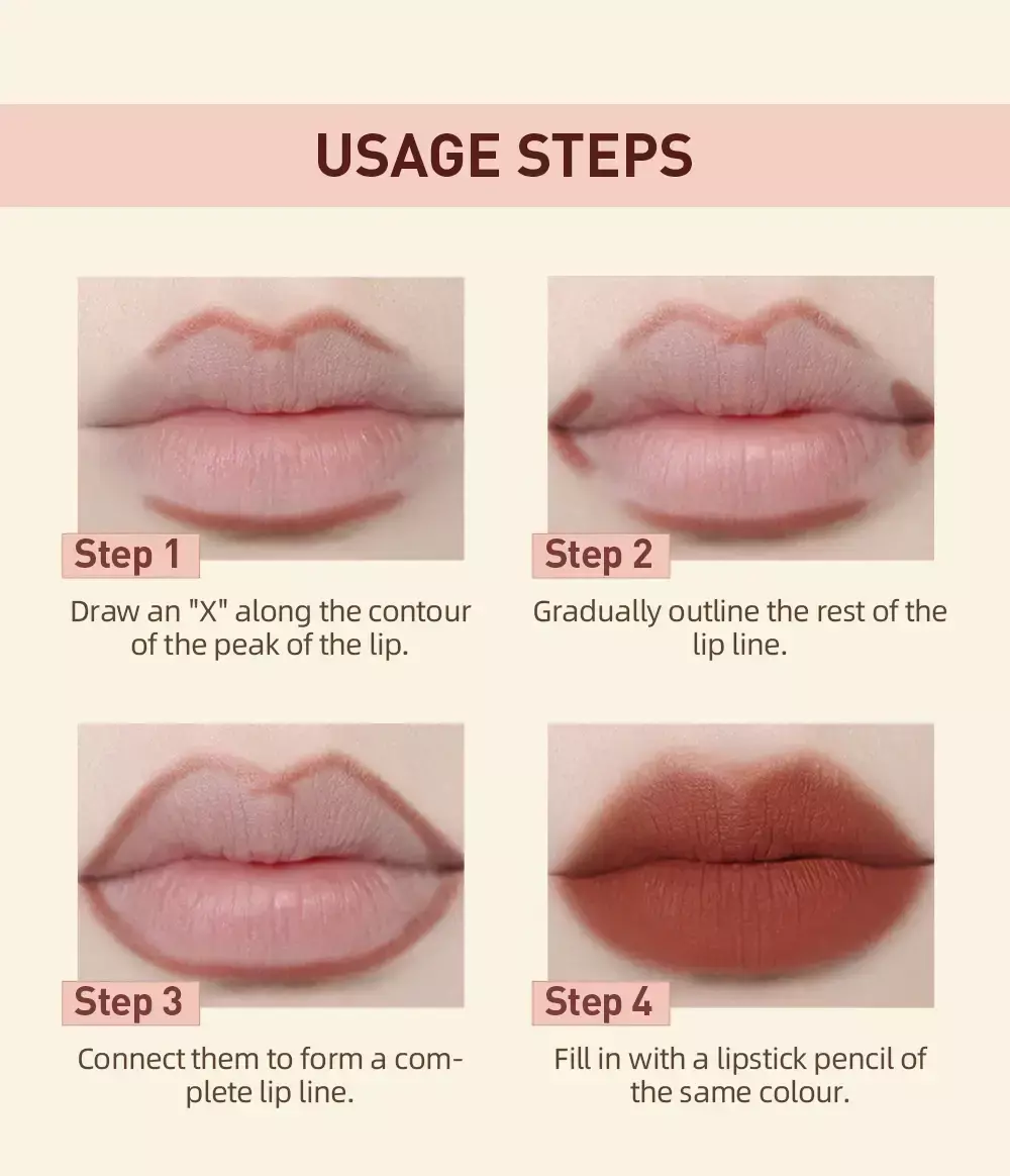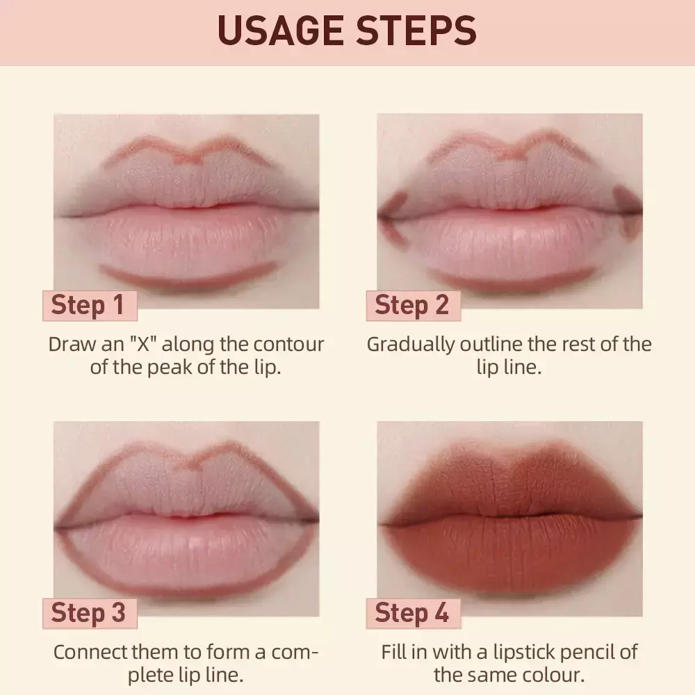 Uma combinação de delineador labial e batom para o visual labial ideal que embeleza o formato dos lábios.